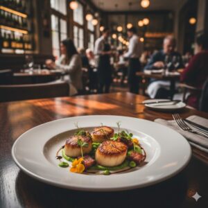 Accompaniments: The scallops are nestled on a vibrant green pea purée and are accompanied by small cubes of crispy pork belly or pancetta.
